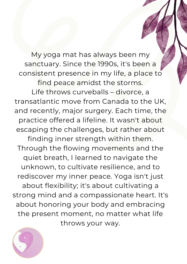 “My journey with yoga began in 2001 when I attended my first Ashtanga session in Ontario, Canada. Over the years, yoga has become a significant part of my life, helping me navigate life’s ups and downs. I’ve studied and am qualified in Hatha Yoga, Yin Yoga, and Chair Yoga. I’ve also achieved certification as a Meditation Instructor.”